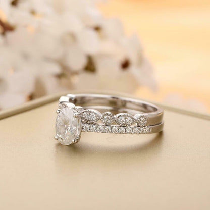 Expertly crafted and stunningly beautiful, this 2.04 Ct Oval Moissanite Bridal Set offers a timeless and elegant look. With a sparkling oval-cut center stone and a delicate band adorned with shimmering side stones, this set is the perfect choice for a bride who wants both quality and style. Made from durable and ethically-sourced moissanite, this bridal set is a smart and eco-friendly choice for any couple.